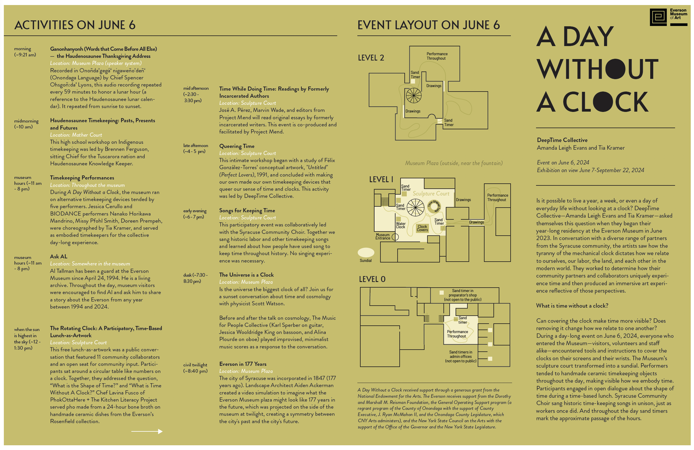 Produced during year-long artist residency by invitation (support from Garth Johnson and Adam Carlin). A Day Without a Clock was generously funded by the 2023 National Endowment for the Arts (NEA), Performing Artist Projects Grant and the Everson Museum of Art.