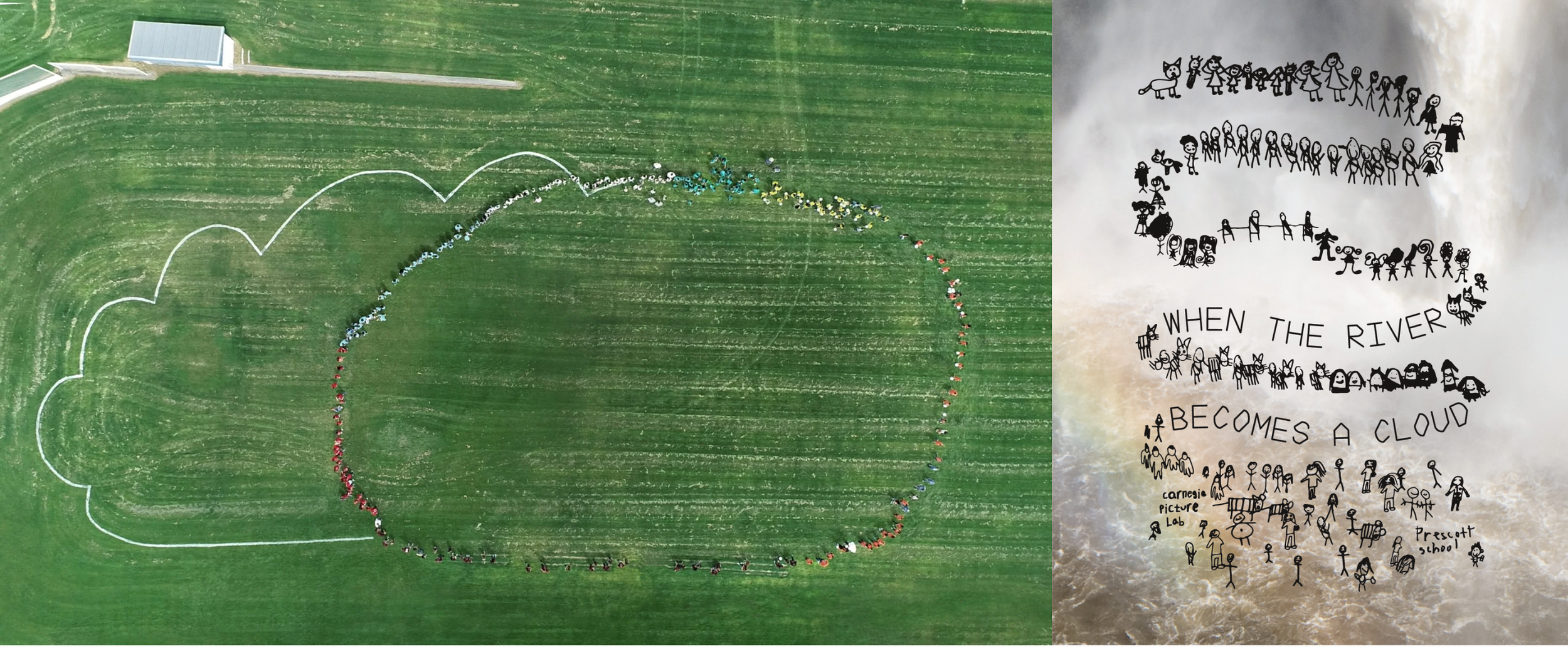 When the River Becomes a Cloud / Cuando el río se transforma en nube is a multi-year, interdisciplinary public artwork that artist Amanda Leigh Evans and I are developing in partnership with students, teachers, and staff at Prescott School District (PSD), a preK-12 public school in rural Eastern Washington. Together, we are building a collaborative, multi-media, permanent public artwork in the form of a river that winds throughout the school’s indoor and outdoor campus. The project utilizes artistic and scientific inquiry to examine local ecology and watersheds, industrial agricultural systems, and the movement of people, water, animals, and agricultural goods across geopolitical borders.